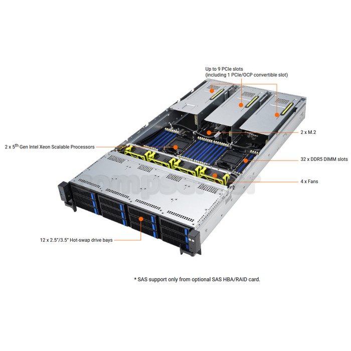 2U, Dual Xeon Scalable Gen4, Gen5, C741, 32x DDR5 ECC RDIMM 8-Channel 4th: 4800 MHz (1DPC)/ 4400 MHz (2DPC), 5th: 5600/4800 MHz (1DPC)/4400(2DPC), 12x 3.5/2.5, (8x NVMe U.2/SATA/SAS, 4x NVMe U.2/SATA) с горячей заменой, 2x M.2, 6x (FHHL) x8 (Gen5), 1x PCIe Gen5 x16 (FHFL), 1x LP x16 (Gen5 x16), 1x FHHL OCP 3.0, 2x10Gb (Intel X710-AT2), 1x Management LAN, блок питания 2x2600W 80 PLUS Titanium redundan, GSM, (салазки в комплекте), глубина 840 мм