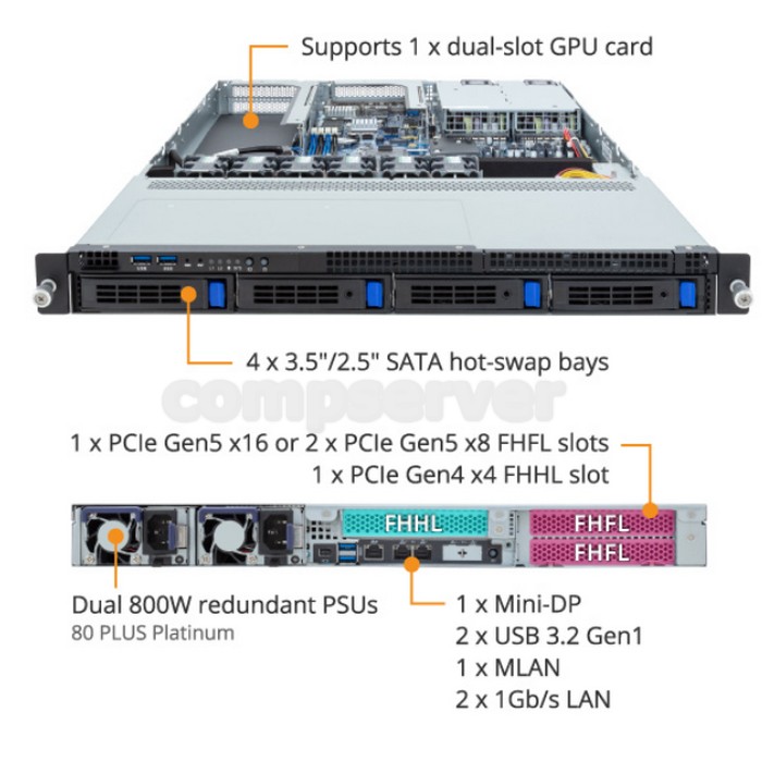 1U, 1xLGA-1700, TDP 95W Intel C262 (MX14-BL1), 4x DDR5 4400 MHz ECC Reg RDIMM/LRDIMM (2-channel), 4×3.5 SATA3 с горячей заменой, 1x M.2 (2280/22110), 1x FHFL x16 (Gen5 x16) или 2x FHFL x16 (Gen5 x8), 1x FHHL x4 (Gen4 x4), 2x 1Gb/s LAN (I210-AT), блок питания 2x800W 80 PLUS Platinum redundant, GSM, глубина 710мм, (салазки опционально)